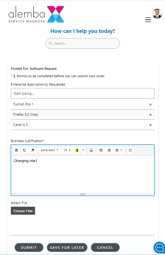 Structured like this, the only service action needed for the Self Service Portal then would be an Software Request that has a CI Search field (multi or single select) allowing the users to select the enterprise Application(s) needed.