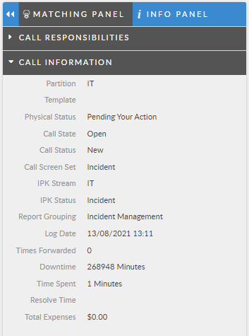 The Info Panel is to the right of the Call Details pane. This shows information such as analyst, SLA, and call status details. The Information Panel is hidden by default but can be shown by clicking the arrows.