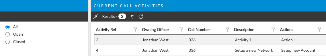 To action or view a call activity from the list, click the action icon in the menu bar, or double-click the item.  You can also enter the call number directly into the **Global Search** and access the [call activities from the ticket](#viewing-call-activities-from-a-call-ticket).