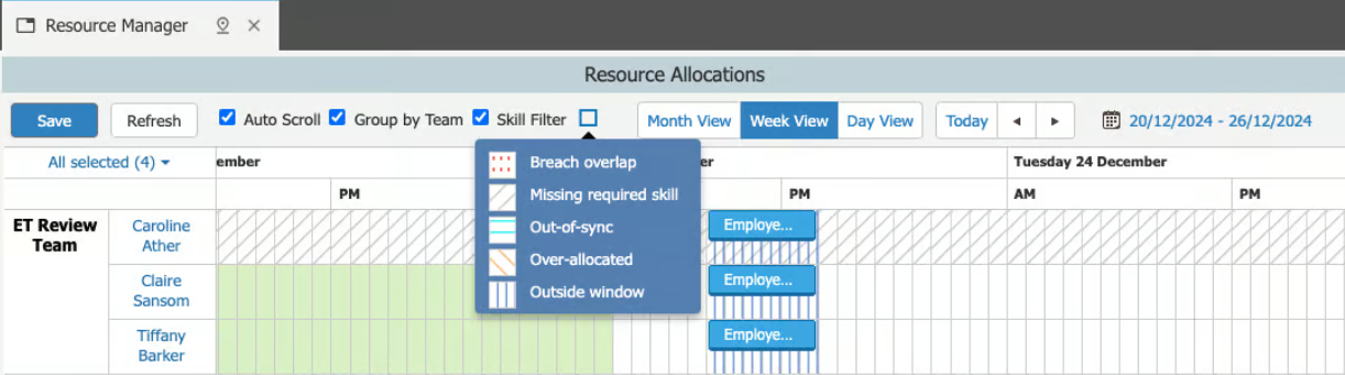 <table><thead><tr><th width="196">Save</th><th>saves all of the changes to resource allocation</th></tr></thead><tbody><tr><td>Refresh</td><td>cancels all of the changes made to task details or allocations since the last time you saved</td></tr><tr><td>Auto Scroll</td><td><p>Select to ensure that the optimum time frame for the task allocation is always displayed in the window when you start to allocate a task.</p><p>You may choose to deselect this option and manually choose the date display if, say, you want to allocate tasks in a different timeframe.</p></td></tr><tr><td>Group by Team</td><td><p>Select to group the displayed analysts in their resource managed workflow groups. If an analyst is a member of several workflow groups, they will appear in each group. Their task allocations will be displayed in each entry.</p><p>Deselect to display the analysts independent of their workflow groups. They will be displayed in alphabetical order.</p></td></tr><tr><td>Skill Filter</td><td><p>Select to show which analysts have the appropriate skill set to complete a selected task.</p><p>See Allocating Tasks According to Skills for more details.</p></td></tr><tr><td>Month/Week/Day View</td><td><p>You can change the granularity of the calendar, choosing between Month, Week and Day.</p><ul><li>In <strong>Month</strong> view, you can view the calendar in half day time slots, grouped by day.</li><li>In <strong>Week</strong> view, you can view the calendar in one hour slots, grouped by half day.</li><li>In <strong>Day</strong> view, you can view the calendar in 15 minute slots, grouped by hour.</li></ul></td></tr><tr><td>Today</td><td>Select to return the display to show today's date, if the current date is not displayed.</td></tr><tr><td><img src="https://1375663122-files.gitbook.io/~/files/v0/b/gitbook-x-prod.appspot.com/o/spaces%2FhlW9jKl7dcDggHAPhNU9%2Fuploads%2FKZZrVFWLdU1G2NLztIKk%2Fimage.png?alt=media&#x26;token=6cdac516-6eeb-4922-9f04-78d563a99b43" alt="" data-size="original"></td><td>Use the left and right arrows to display the month/week/day before or after the current one, depending on the granularity of the display</td></tr><tr><td><img src="https://1375663122-files.gitbook.io/~/files/v0/b/gitbook-x-prod.appspot.com/o/spaces%2FhlW9jKl7dcDggHAPhNU9%2Fuploads%2F5ADGxUcLv4KJ3APQzA5N%2Fimage.png?alt=media&#x26;token=56077ca9-aa18-4699-85e0-58bc6693e0cc" alt=""></td><td>Select to display a calendar drop down, from which you can choose a date (range) in the normal way</td></tr></tbody></table>