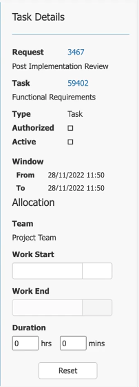 <table><thead><tr><th width="191">Task Details</th><th>The upper section contains the task details. You can use the scroll bar to the right of the section to scroll up and down if all of the details are not visible on your screen.</th></tr></thead><tbody><tr><td>Request</td><td>Request Number and Description. Click on the request number to open the request in a new tab</td></tr><tr><td>Task</td><td>Task Number. Click on the number to open the task details in a new tab</td></tr><tr><td>Type</td><td>Task type</td></tr><tr><td>Authorized</td><td>Indicator whether the task is authorized</td></tr><tr><td>Active</td><td>Indicator whether the task is active</td></tr><tr><td>Window</td><td>Planned time for the task</td></tr><tr><td>From</td><td>Planned Start date/time</td></tr><tr><td>To</td><td>Target Date</td></tr><tr><td>Length</td><td>Planned time</td></tr><tr><td>Allocation</td><td>The lower section of the Task Details pane shows allocation information, as described below.</td></tr><tr><td>Team</td><td>The workflow group to whom the task is assigned</td></tr><tr><td>Work Start</td><td><p>The date on which the analyst is expected to start the task. This field is completed by either dropping the task on the calendar in the Resource Allocations pane, using the calendar keys, or keying in a date/time.</p><p>See Allocating Tasks in Resource Manager for more details.</p></td></tr><tr><td>Work End</td><td>The date/time when the task is expected to be complete. This is automatically completed based on the <strong>Work Start</strong> and <strong>Duration</strong> details and is read only.</td></tr><tr><td>Duration</td><td>The length of time that the task is expected to take. This is an editable field, and the details are updated in the Task Details window accordingly.</td></tr></tbody></table>