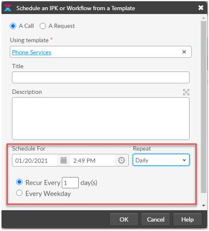 <table data-header-hidden><thead><tr><th width="234.5"></th><th></th></tr></thead><tbody><tr><td>Using Template</td><td>Use the Search to find the template that will be used to create this request from the list.</td></tr><tr><td>Title</td><td><p>Specify a name for the schedule</p><p><strong>This field is only used to describe the title of the schedule; it is not transferred to the ticket itself</strong></p></td></tr><tr><td>Description</td><td><p>Type in the relevant information about the schedule you are creating.</p><p>This field is useful if you wish to provide details as to why this request is being scheduled. <strong>The details are not transferred to the ticket.</strong></p></td></tr><tr><td>Schedule For</td><td>Specify the date and time on which the request should be created</td></tr><tr><td>Repeat</td><td>Use the drop-down list to specify how often this request should be created. You can select the request to be created once (no repeat of this request), daily, weekly, fortnightly, monthly or quarterly</td></tr></tbody></table>