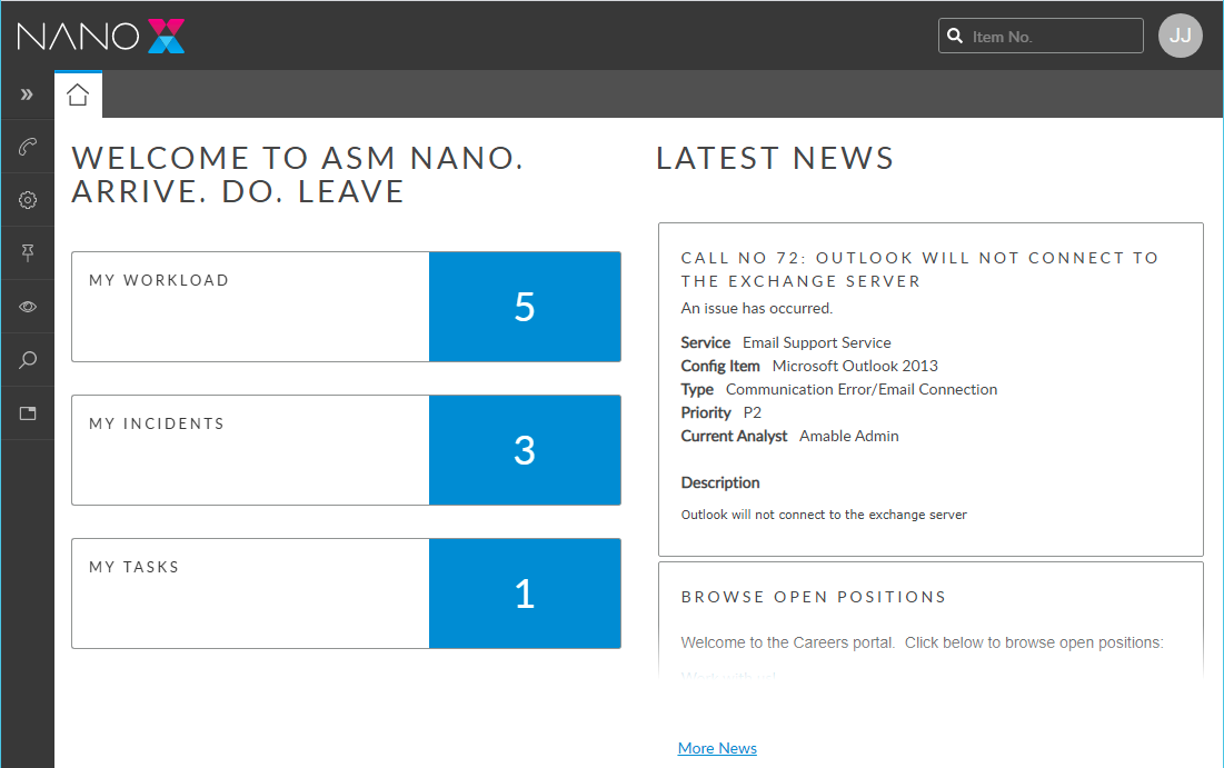 Select the house to return to the Home page. The Home page contains a scrolling bulletin board, and the My Counts widget which shows the number of calls, tasks, requests the analyst has, as well as the workload total which combines all three.