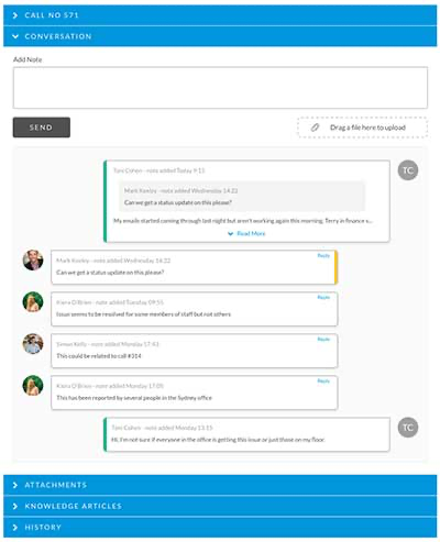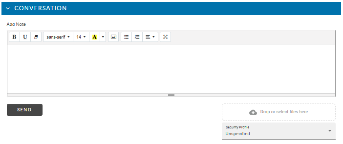The Conversation Widget provides the ability to add an Attachment to the Call (Drop or Select files). It reveals in conversation form, the interactions between support and the user.