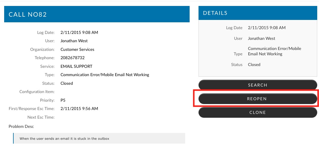 To reopen a ticket that has been closed/resolved, you simply need to locate the ticket and click "**Reopen**".