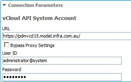 When creating a new VMware vCloud Director source from the Source option of the Integration Platform, some specific parameters have to be entered. The screenshot below illustrates an example of connection details to a VMware vCloud Director source.
