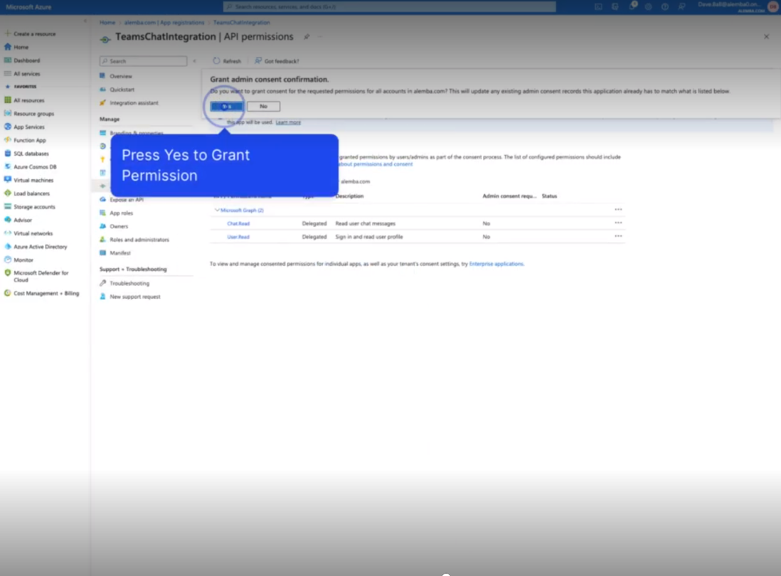 Select Grant Admin consent for the domain and press Yes to grant permission.
