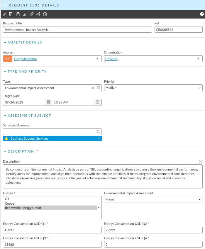 You can update the results of the Environmental Impact analysis directly to the service and therby closing the loop on the assessment. This also exposes the data to the service and allows you to use it for reporting and additional analytics that you will need for your TBL Accounting program.
