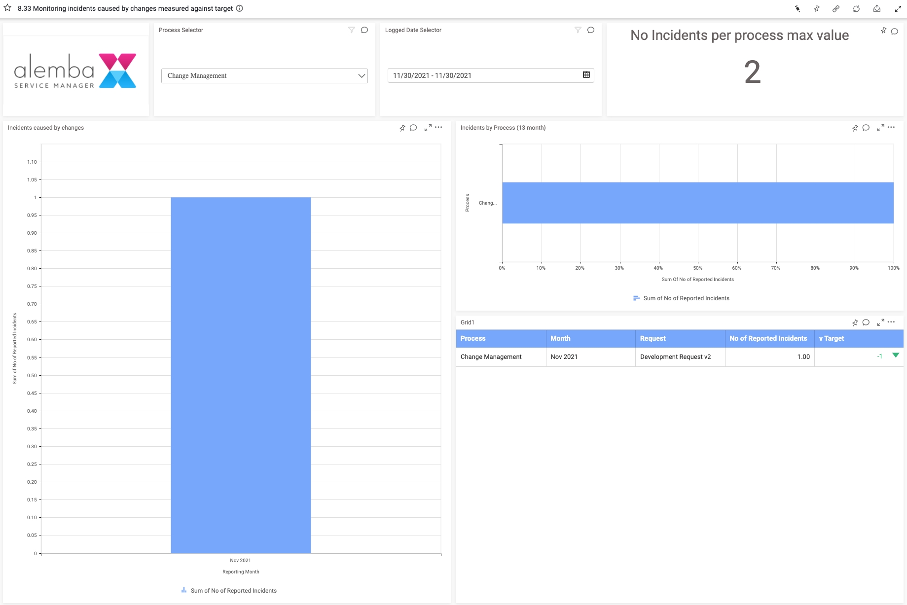 No of incidents raised per month (13 month rolling, Incidents per process (all 13 months by default) and by process and request title against target