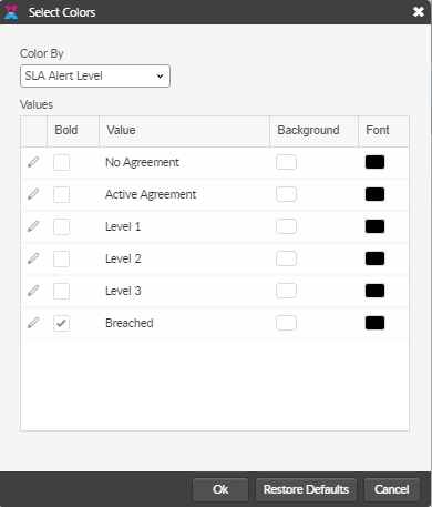 The Color By list contains list-based columns (such as Call Priority) from the Selected Columns list. Your selection dynamically populates the Values table.