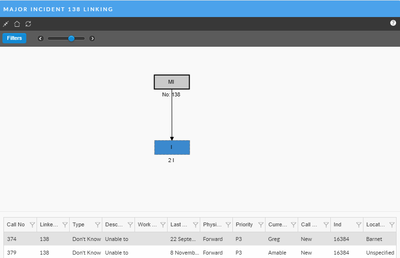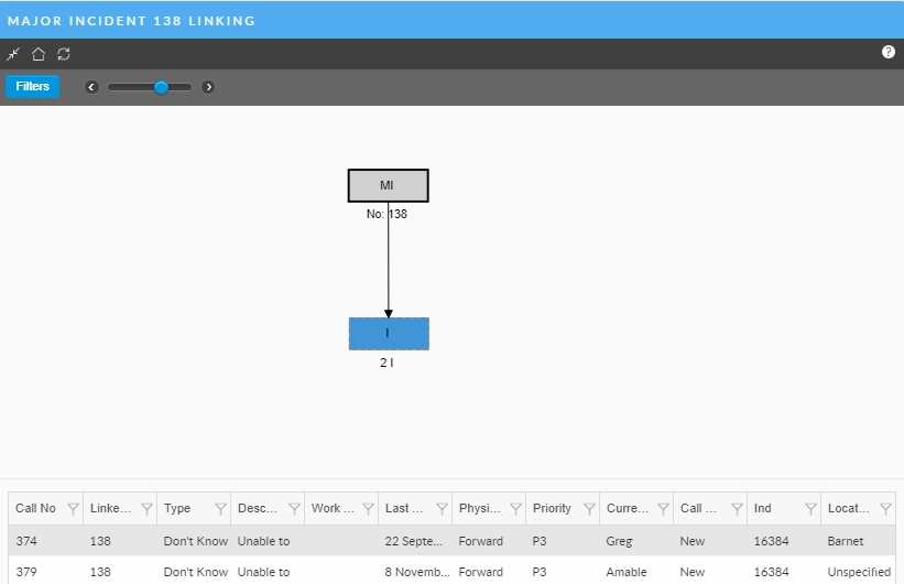 When you link calls of the same type, say two Incidents, the calls are grouped into one node and total number of calls appears. If you select the node, all the calls that make up the node are displayed in the table below. The nodes in the linking diagram display the abbreviation assigned to the IPK status of the linked calls. The colors assigned to a node are those that are assigned to the IPK status. However, the current call is always displayed in gray. This is to make it easy for you to identify the current call on which you are working.