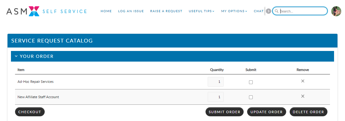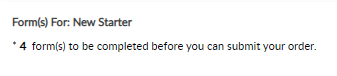 ASM is able to bundle several requests. For example, a New Starter request may have many moving parts and forms to complete before you can submit the order. When this is the case, the top of the screen will display the number of forms left to complete,