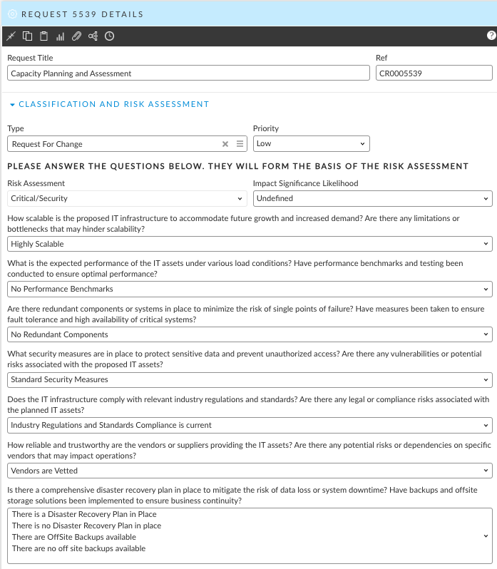Your capacity Planning Workflow template will typically take the form of several questions tied to the risk calculator that will then formulate the overall risk.