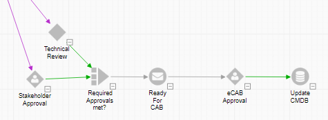 After an initial task (for example, scoping the change request) is completed, three approvals are activated, one for each of the three managers described above.