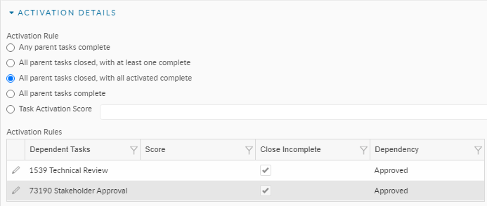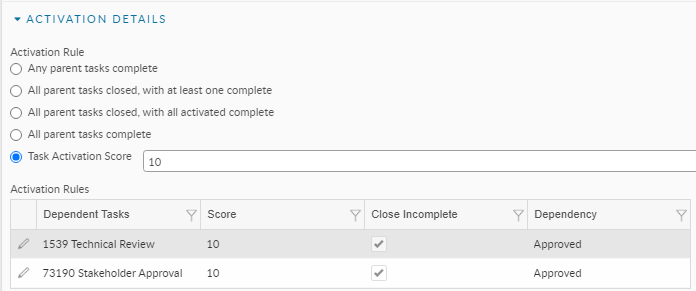 A specified amount of activation points have been generated before the task is completed. Activation Rules allow certain tasks to become active even if all their parents have not yet been approved or completed. You can set an amount of activation points required for a task or approval to proceed (the Task Activation Score), based on how many points its parent tasks are worth.