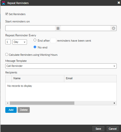 <table data-header-hidden><thead><tr><th width="203.5"></th><th></th></tr></thead><tbody><tr><td>Set Reminders</td><td><p>Select this check box to enable the other fields in the window.</p><p>De-select this check box to disable the repeat reminder and disable other fields in the window.</p></td></tr><tr><td>Start Reminders on</td><td><p>Select the date and time for the first reminder notification.</p><p>This field is visible on calls, submitted requests, and active tasks. It is not visible in template items.</p><p>A date and time may already be populated in this field if:</p><ul><li>A Single Reminder is active - the date and time of the Single Reminder is displayed</li><li>A Repeat Reminder was previously set and then completed, or was set and then disabled.</li></ul></td></tr><tr><td>Start Reminders</td><td><p>Select the period of time after the call, request, or task is submitted/activated, to send the first reminder notification. Type a number between 0 and 99 into the number field and select the period from the drop down. Entering "0" sends the reminder immediately on submission/activation. Leaving the number field blank on Save defaults it to "0".</p><p>Type "16" and select "Hour" to start reminders 16 hours after the task is activated.<br>Type "2" and select "Day" to start reminders 2 days (48 hours) after the request is submitted.<br>Type "0" and select any value from the drop down to start reminders immediately after the call is submitted.</p><p>This field is visible on template items and un-submitted items; this includes call templates, workflow templates, tasks in workflow templates, un-submitted requests, and inactive tasks.</p></td></tr><tr><td>Repeat Reminder Every</td><td><p>Set the period of time between each subsequent reminder. Type a number between 1 and 99 into the number field and select the period from the drop down. Leaving the number field blank on Save defaults it to "1".</p><p>Type "45" and select "Minute" to send reminders every 45 minutes after the first reminder.<br>Type "3" and select "Day" to send reminders once every 3 days (or once every 72 hours) after the first reminder.</p><p>These settings are ignored if <strong>End after</strong> [_] <strong>reminders have been sent</strong> is set to "1"</p></td></tr><tr><td>Calculate Reminders using Working Hours</td><td><p>Leave unselected to use a 24/7 calculation. Select to apply the working hours of the call, request or task to the Reminder calculations. Working Hours will be applied to the calculation for sending the first reminder (the <strong>Start Reminders</strong> field) and the interval for subsequent reminders (the <strong>Repeat Reminders Every</strong> field).</p><p>On a call template <strong>Start Reminders</strong> is set to "1" and "Day". A call from that template is submitted at 2 PM on Monday.</p><ul><li>If Working Hours is unselected the first reminder is sent at 2 PM on Tuesday (24 hours later using a 24/7 calculation).</li><li>If Working Hours is selected and the working hours are 9:00 AM - 5:00 PM, the first reminder is sent at 2 PM on Thursday (24 hours later using an 8 hour per day calculation)</li></ul><p>The working hours of a call, request or task is the Working Hours defined as 'Default' in System Admin; unless an SLA/OLA agreement is attached, in which case the Working Hours on the agreement , if defined, is used.</p></td></tr><tr><td>End after [_] reminders have been sent</td><td><p>Specify the number of reminders you want to send before ending the reminder.</p><p>Select the radio button to enable the number field then type a number between 1 and 99. Entering "1" sends only 1 reminder. Entering "2" sends the first reminder and one repeat. Leaving the number field blank on Save defaults it to "1".</p><p>This will only end the reminders; it will not close the call/request.</p></td></tr><tr><td>No end</td><td>This radio button is selected by default. Reminders will continue at the specified interval until the item is closed or completed.</td></tr><tr><td>Message Template</td><td><p>Select the email message template to use for this reminder and any defined repeats.</p><p>The default message template can be modified in ASM Designer, or new message templates created and mapped to the relevant Message Types in System Administration.</p></td></tr><tr><td>Recipients</td><td><p>Add or remove recipients for the reminder and configure whether they will receive email or pager notifications.</p><p>Press <strong>Add</strong> to display the Finding Recipients window in which you can search for and add recipients. Press in the Recipients window to add those recipients to the Reminder Recipients table. In the Reminder Recipients table, select the <strong>Email</strong> or <strong>Pager</strong> check boxes to send email or pager notifications to each of the selected recipients.</p><p>To remove recipients from the table, select the record in the Reminder Recipients table and press <strong>Remove</strong>.</p><p>The <strong>Email</strong> and <strong>Pager</strong> check boxes will not be displayed if <strong>Email</strong> and <strong>Pager</strong> (respectively) are not selected in Messaging in System Administration. In this scenario no email or pager notification is sent to the recipients.</p><p>When no recipients are set, no email or pager is sent, and the reminder is visible in Search and Outstanding windows.</p></td></tr></tbody></table>