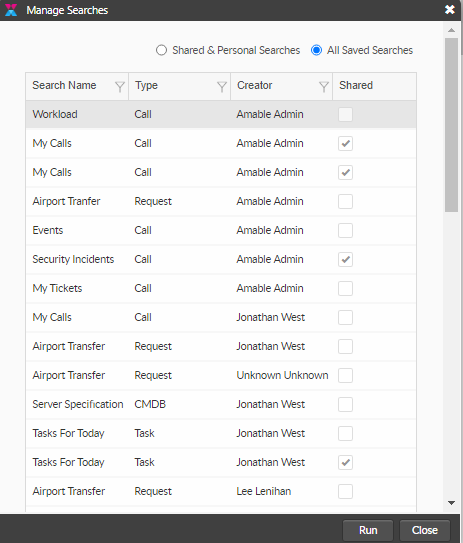 The Manage Searches window appears, with a list of all searches that you have saved, and a checkbox alongside each search showing those that are currently shared with you.